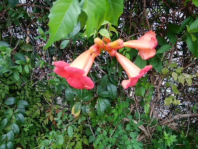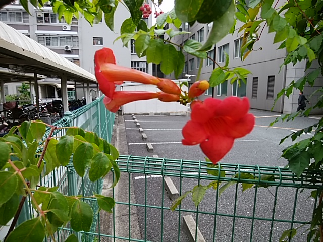 森之宮のUR団地の入り口にまたまた凌霄花の花が咲いていました。「のうぜんかずら」という花の名前がやっと頭に入りました。