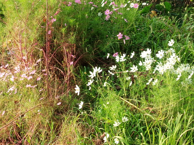 刈り取られた田んぼの片隅で白とピンクの花を咲かせたコスモスの大木が倒れていました。
