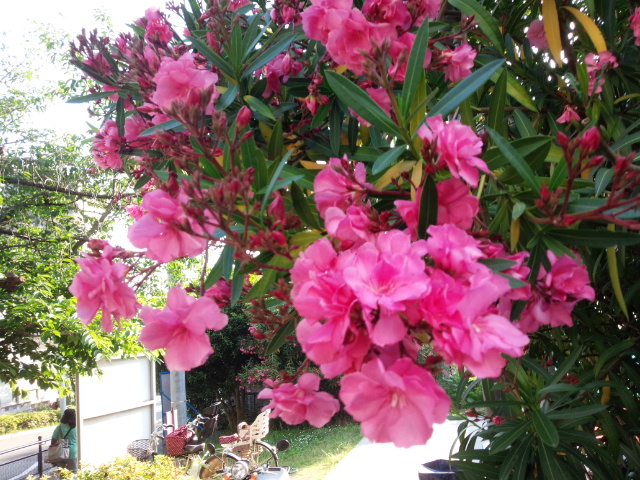 暑い一日でしたね。夾竹桃(きょうちくとう)の花が咲き始めました。午後5時過ぎの太陽はまだまだ元気いっぱいで夾竹桃の花が『暑いよー』と訴えていました。