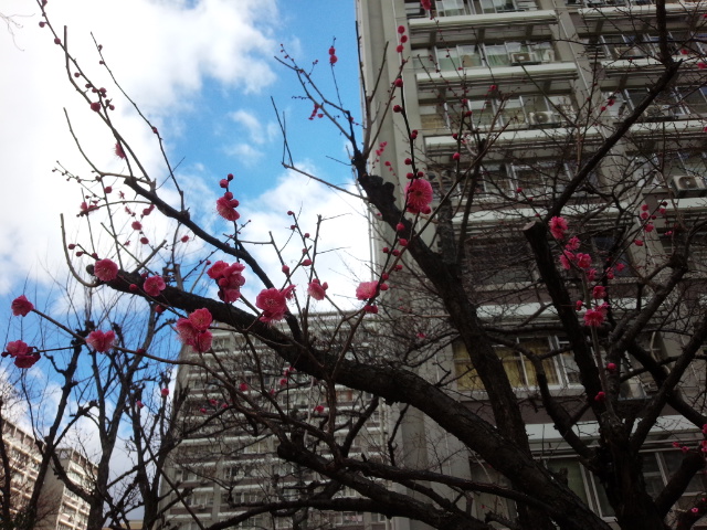 森ノ宮のUR住宅内の緑地に咲いている梅の花です。ビルの向こうに見える青空とピンクの花、黒い古木が絶妙な味わいを醸し出していると思いませんか?