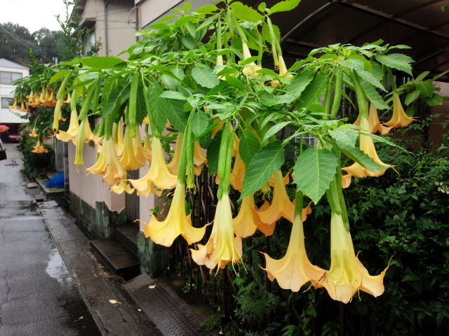 雨の中、エンゼルトランペットが垂れ下がるお宅を発見しました。