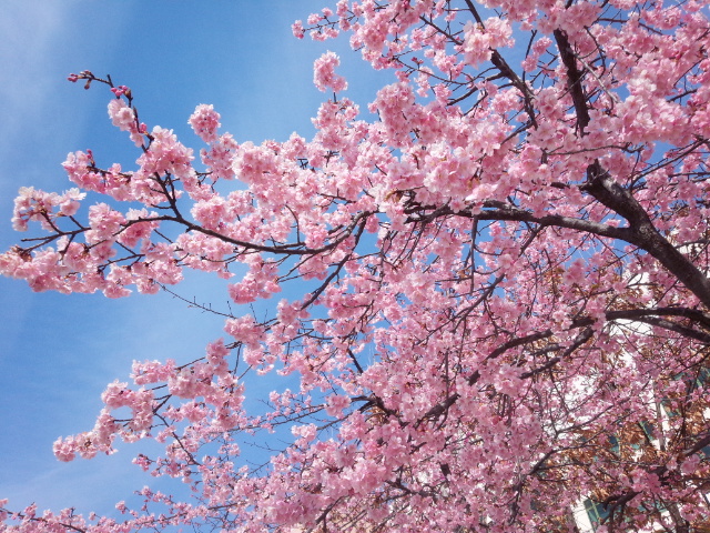 箕面イオンの前のかやの広場の河津桜が満開でした。2010年からこの桜を撮影していました。