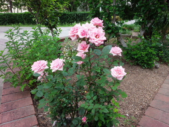 UR森ノ宮団地の中の大きな水槽(お魚が泳いでいます)の横に、ピンクの花が咲いているのが目につきました。カーネーションかなと思い、近づいてみるとバラの花でした。