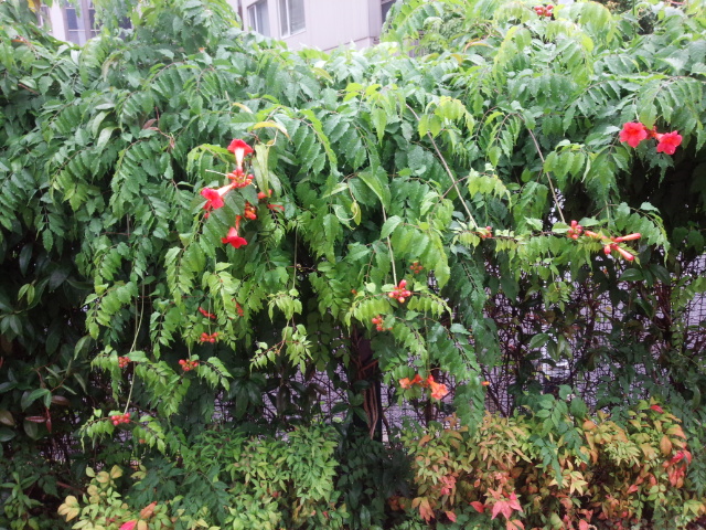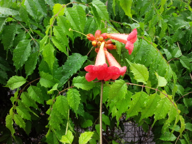 ノウゼンカズラの花が咲き始めました。赤いラッパのような花です。