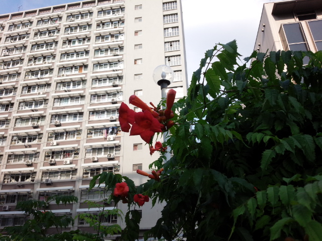 十何階の高層団地を見上げるようにラッパを開いていました。この団地の下を通るたびに何階建てか、目で数えることがあるのですが、最後まで数えられたことがありません。