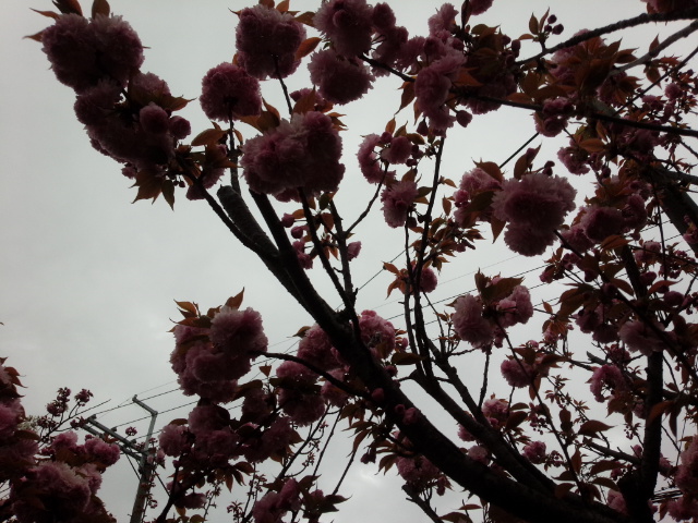 小雨降る中、八重桜が咲いているのを見つけました。いよいよ僕たちの出番と張り切っているように見えました。もこもこと花びらが集まって花束をあちこちに作っています。