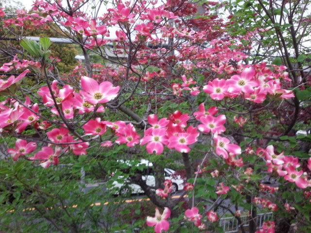 夕方、粟生団地のバス停をおりてふと横を眺めると、赤い花が咲いていました。ピンクの八重桜があちこちで見えるのですが、この色はあまり見なかったので目が行ったのかも知れません。