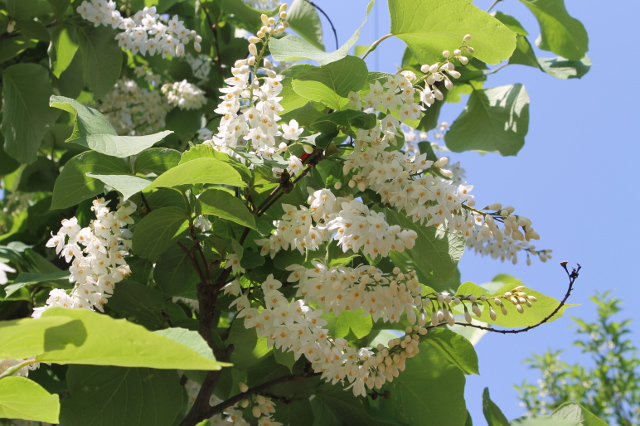ふと見上げるといつも見ている見慣れている木に小さな花がたくさんついているのを目にしました。ミドリの葉っぱに白い花、青空がバックに見えて爽やかな写真が撮れました。