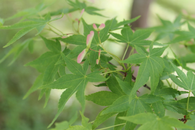 青い葉っぱの紅葉の葉っぱが風に揺れていました。よく見るとところどころにピンクの花が見えました。その花もわずかな風にユラユラ揺れてシャッターを押す私の指を弄んでくれました。