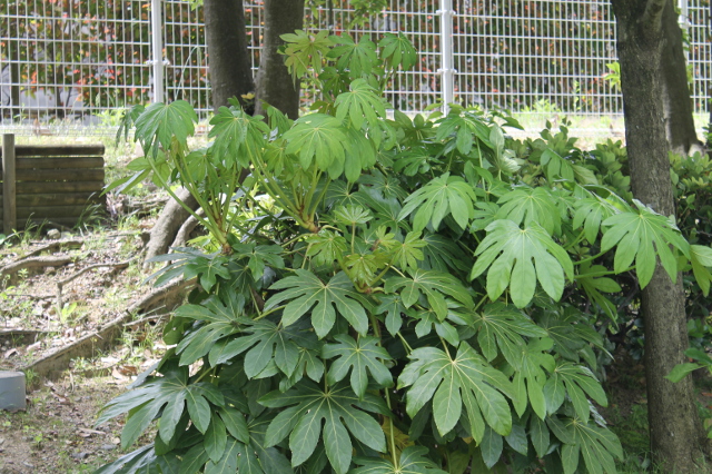 団地の裏庭のほうにヤツデの木があります。大きな葉っぱに子が生まれるように大、中、小さまざまな大きさの葉っぱが積み重なっています。緑の色も濃い緑から黄色に近い緑まで様々です。