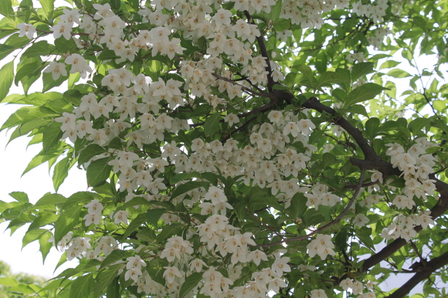 足下に小さな白い花が散らばっていました。見あげるとびっしりと白い花が下向きに咲いていました。何の花でしょうか?