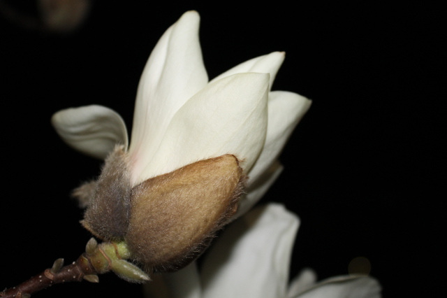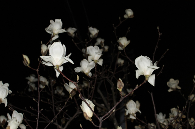 木蓮の花が咲き始めました。真っ白な白木蓮です。夜空をバックに撮ってみました。