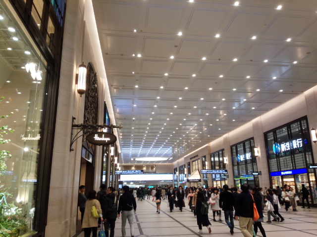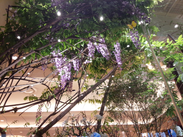 梅田の阪急百貨店のショーウインドウにフジの花が咲いていました。一つ一つ眺めていくと全部本物の花や木でチューリップやラナンキュラスが美しく咲いていました。