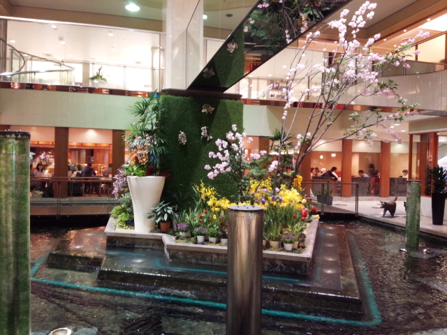 こちらは阪急3番街の人工池の中の寄せ植えです。さくらが咲いていました。