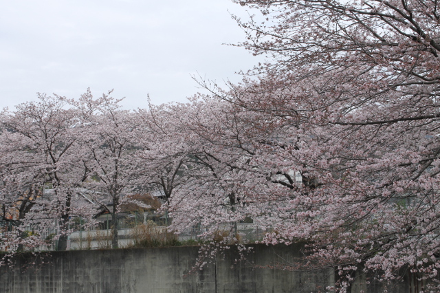 日曜日、勝尾寺川からの帰り道に出会った桜です。大きく道の上にせり出していて間近にたくさんの花びらを見ることができました。放射状に花柄が伸びてそれぞれに先割れの花びら5枚が広がっています。花と花の間にはピンク色のつぼみが顔を出しています。
