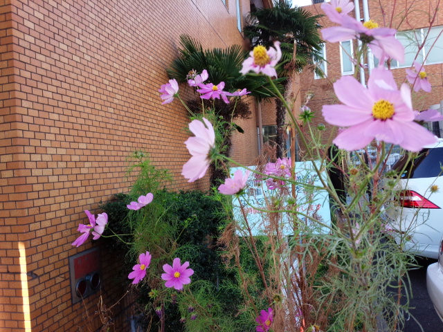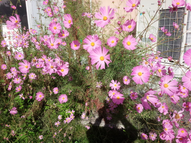 秋の朝、清々しい空気の中、ピンクのコスモスがたった今爆発したように咲いていました。