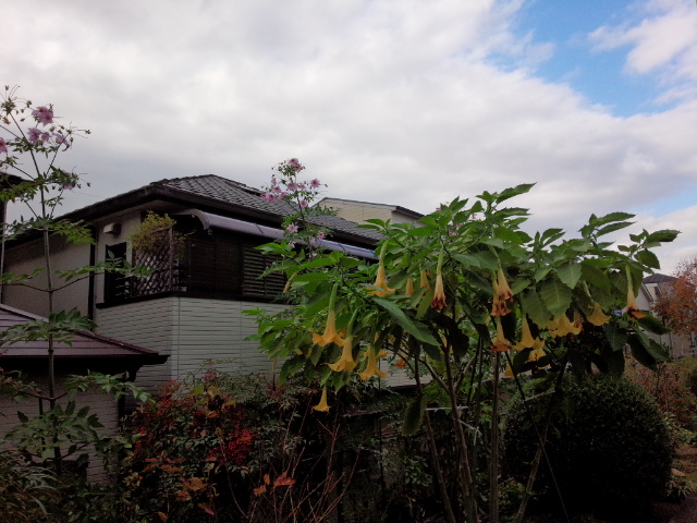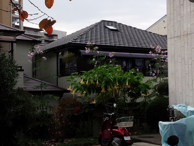 雨の中、エンゼルトランペットが垂れ下がるお宅を発見しました。