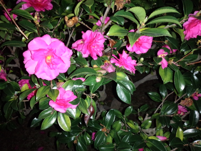 黄昏時、山茶花の花が咲いていました。見た目はもっと赤かったのですが、写真にするとちょっと桃色っぽい花色になってしまいました。