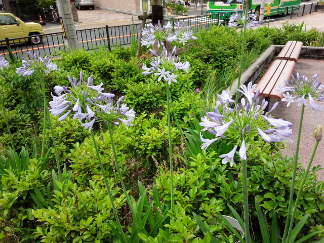 いろいろなところでアガパンサスの花が咲いています。このブログでも2010年からアガパンサスが登場しています。高槻市営バスがちらっと写っていますのでここは高槻ですね。