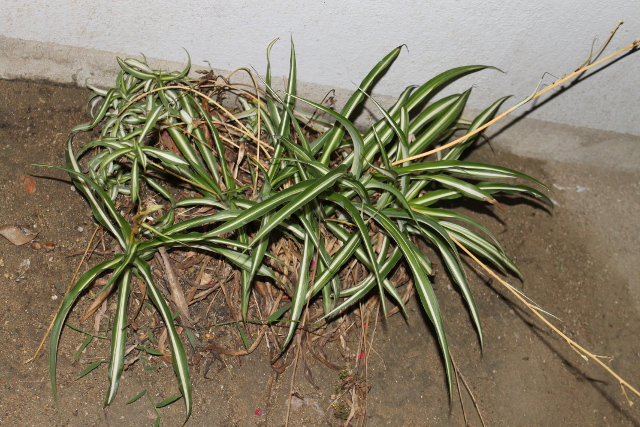 地面に植えたオリヅルランに水をあげると元気になりました。毎日見てるので変化になかなか気づきませんが、かなり勢力を増してきたようです。