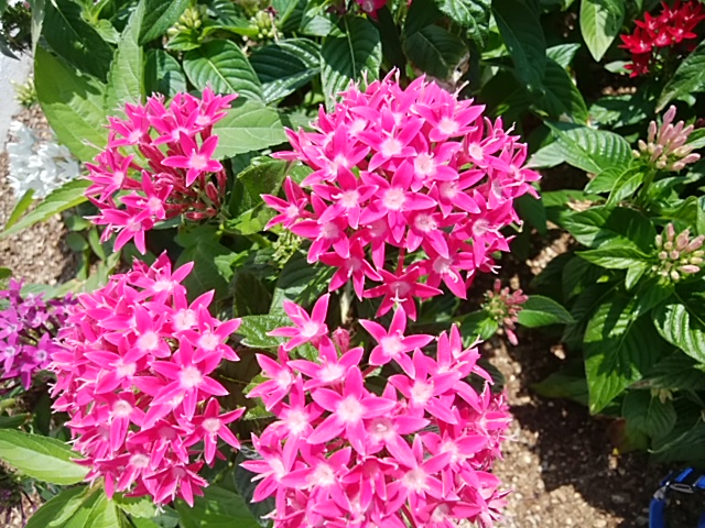 近畿大阪銀行粟生出張所の前の道路に置かれたコンクリートの大きなプランターの中に見事に咲いていました。ぎらぎらの夏の陽射しをまともに受けて、光り輝きながら咲き誇っていました。ネットで調べると「ペンタス」という花の名前でした。