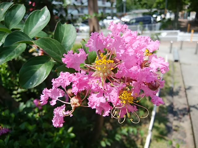 こちらは今を盛りと花を咲かす百日紅です。これはうすいピンク色ですが、今窓から見える百日紅はもう少し濃い色をしています。黄色い蘂(しべ)がきれいですね。
