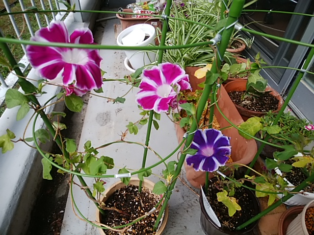 台風一過、昨日の台風21号の通過の際に室内に取り込んで大事にあつかったお礼でしょうか、今朝赤い花と青い花がきれいに咲いてくれました。