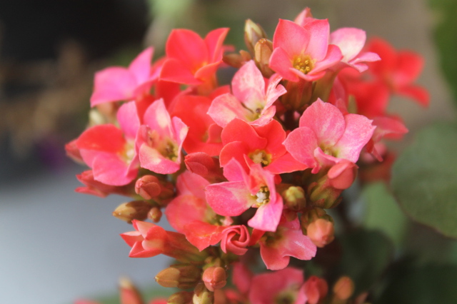 カランコエの花が満開です。長い間、蕾を見せてくれて今か今かと待ちわびていると予想していた花の形ではなくて赤やピンクのちょっとこぢんまりした花姿でした。それが数が増えてくるとこのようにちょっと豪華な姿になってきました。
