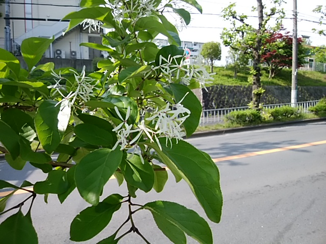 箕面の通称、山麓線の街路樹が植え替えられています。「ヒトツバタゴ」と言って(単葉)一つの葉のタゴ(トネリコ)ということらしいです。今までの木よりかなり細いちょっと見たところちゃっちー木が植えられたなと思っていたら、白い花が咲き始めました。よく見ると、細長く裂けたような花が枝の先に沢山ついていて満開の木は雪が降ったような感じになっていました。