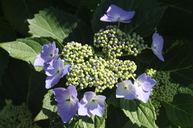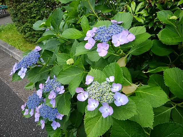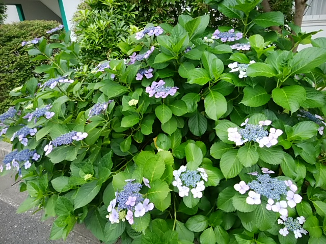 今年の紫陽花は昨年に比べてたくさんの花が重厚に咲いています。昨年の剪定がうまくいったのでしょうね。ここの紫陽花ちょっと貫禄が出てきました。今朝、バックミラー越しにガクアジサイの花群れをみてきれいだなあとつくづく思いました。