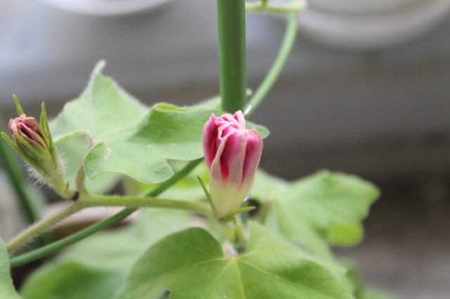 いよいよ、今年一番に咲く朝顔の花が登場してきました。朝からこんな風にほどけて赤い色を見せてくれていたので夕方には咲くだろうと思っていたのですが、やはりあさがおなんですね。