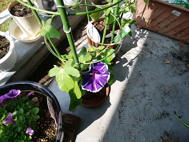 朝顔の青い花と赤い花の両方がついに一緒に咲きました。6月5日に最初の赤い花が咲き、9日に青い花が咲いて、何となく交互に一つずつ咲いていたのが今朝、同時に咲きました。