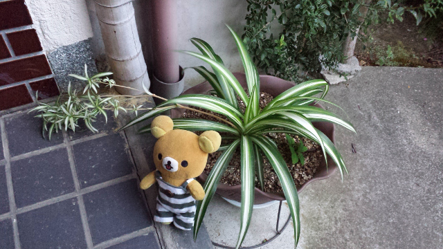 株分けして差し上げたオリヅルランの小さな子苗が大きく成長しました。こんな格好いい鉢に植えられて立派に見えます。葉も太く色づきもかなりいいようです。