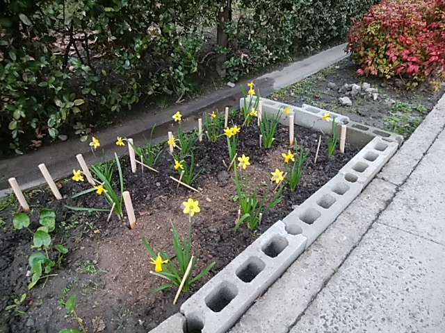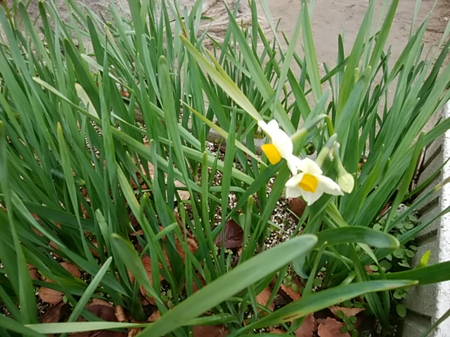森之宮の砲兵工廠後のお地蔵さんの前にある花壇の一番遅咲きの水仙の花が咲き始めました。