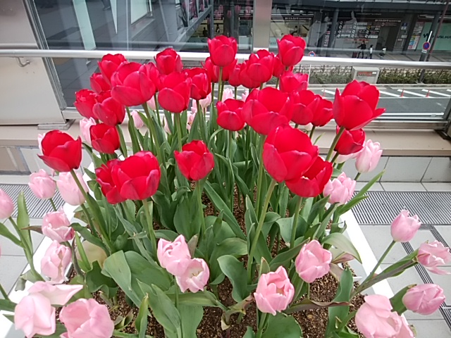 JR大阪駅と阪急とつなぐ歩道橋の上にチューリップが並んでいました。