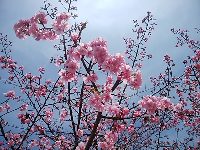 一足早い桜です。箕面のかやの中央にあるショッピングセンター、キューズモール箕面の中にある「かやの広場」にこのセンターができるときに静岡県河津町から寄贈された河津桜だそうです。毎年かなり早く咲くのでこの界隈の人たちに親しまれています。今は新しく駅を作る工事で慌ただしい感じです。それでも下向きに咲く花はきれいです。