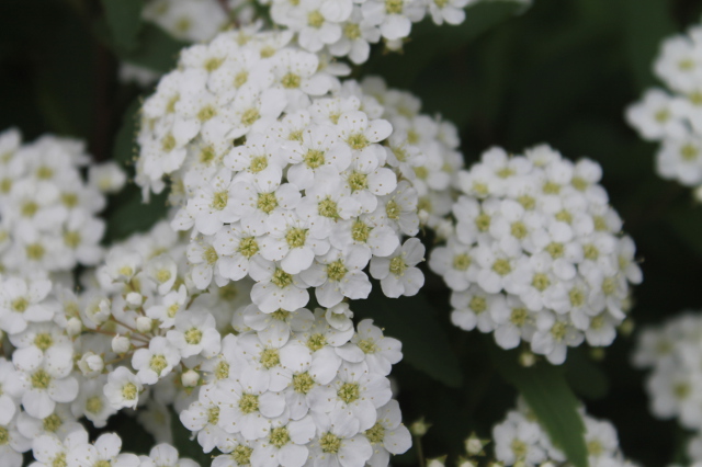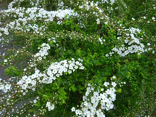おそらく雪柳だと思うのですが、いつの間にか生垣の緑が白く変わってきました。