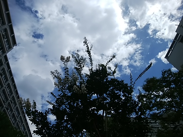 百日紅の白い花が今を盛りに咲き誇っていました。スマホを構えて何度も写してみたのですが、どの角度からも逆光に近い状態になってしまいました。高層団地に囲まれた緑地の中で作百日紅というイメージがよく出ていたのでこの写真を採用してみました。