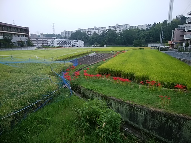 彼岸花の花の色が日増しに濃くなってきています。周りに広がる稲田には、収穫を待つ稲穂が垂れ下がっていました。
