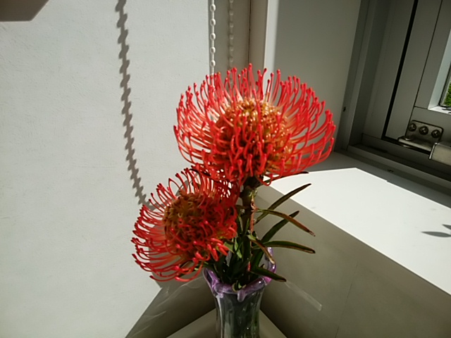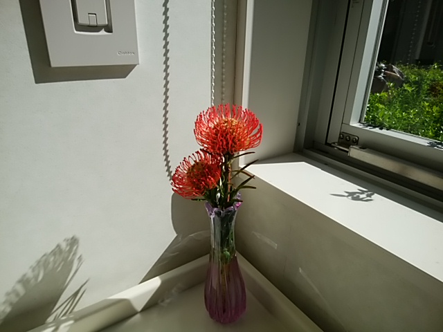 お昼にお弁当を食べて、歯を磨きに洗面コーナーに行くと面白い花が咲いていました。はじめは作り物かと思ったのですが、よく見ると花瓶に入っていて生花でした。こんなおもちゃみたいな花もあるんだと思いながら撮影してみました。