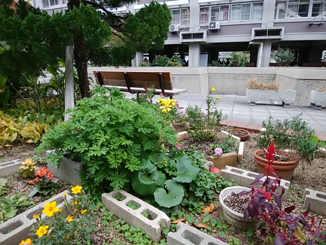 森之宮のUR住宅の花壇に黄色いツワブキの花が咲いていました。大きな葉がその存在をアピールしていたのですが、黄色い花は横の大きな葉群に隠れて見え隠れしていました。