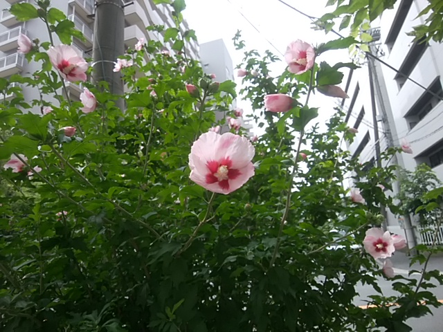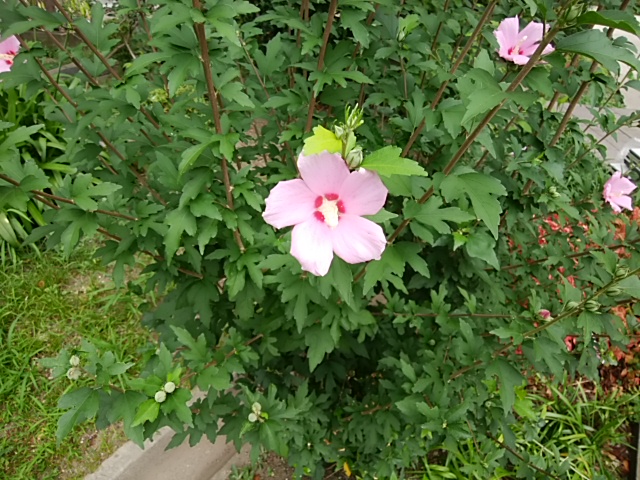 この前から咲き始めた槿(むくげ)のピンクの花です。