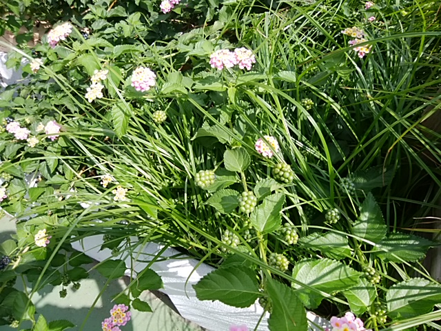 コバノランタナの花がまた咲いていました。花に交じってブドウのような実がありました。この写真でわかるでしょうか?
