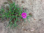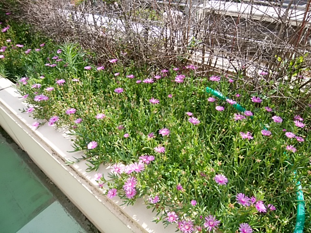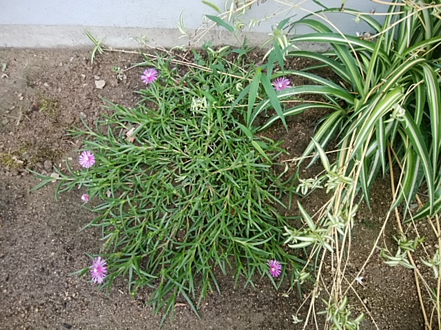 マツバギクの花が暑さに負けそうな色になって咲いていました。咲き始めのようなきれいなピンクではなくて少し色あせた色に見えたのは朝の太陽のせいでしょうか?