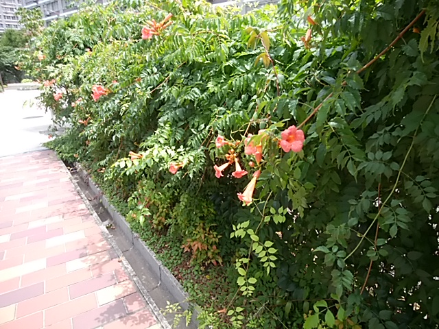 UR団地の入り口にあるノウゼンカズラもまたまた花が増え始めました。リズムがあるのでしょうね。