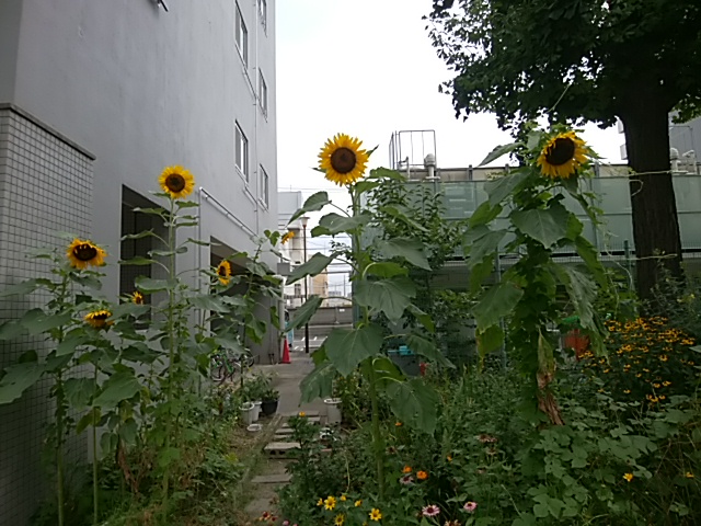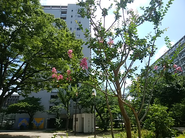 7月26日、朝方の雨が嘘のようなカンカン照りの元、大阪市内を歩きました。砲兵工廠跡のお地蔵さんの横のひまわりが立派に咲いていました。そのひまわりを見つめるように百日紅の花が元気良く咲いていました。このUR団地の緑地内にはいろいろな花が咲いているのですが、百日紅はこれが一番立派でした。