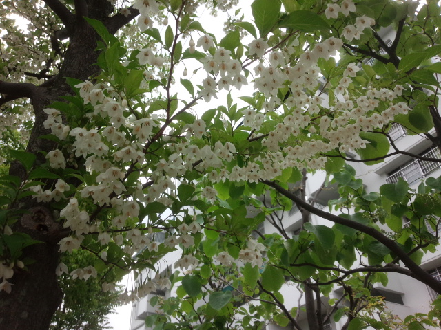 このブログにも何回か登場しているのですが、この白い花おそらくエゴの花だと思うのですが、今年もまたたくさんの花が咲きました。白い小さな花びらが地面に落ちて白い敷物を敷いたようになっていました。