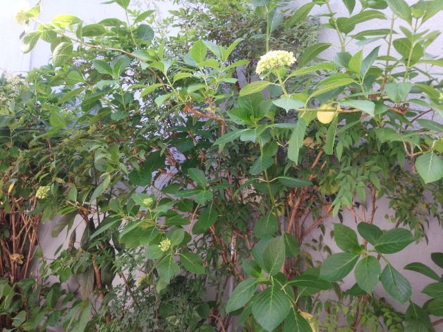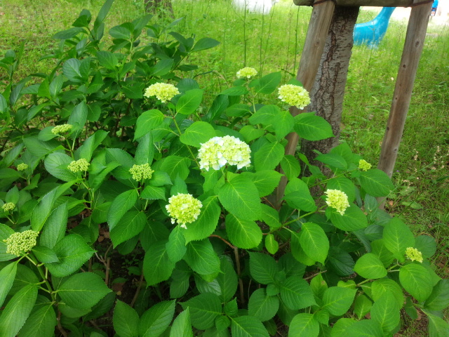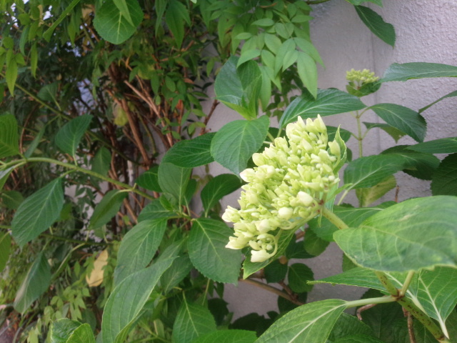 毎年、紫の紫陽花の大輪が並ぶ小道に様子を見に行きました。花の色はまだ白くこれが紫色に変わるまであと半月はかかりそうです。