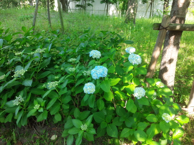 とうとう紫陽花の花に青い色が付きました。朝の光を浴びて新鮮な美しさを見せていました。