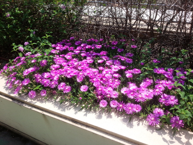 大阪市内に咲いていたマツバギクを挿し木して、我が家に持って帰り窓の下に地植えしていたところ次第次第に葉っぱを増やし、とうとう花が咲きました。